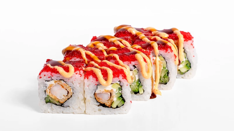 креветки в темпуре, сыр сливочный, огурец свежий, икра масаго, соус Терияки, соус Спайси *товар на фото может отличаться от оригинала