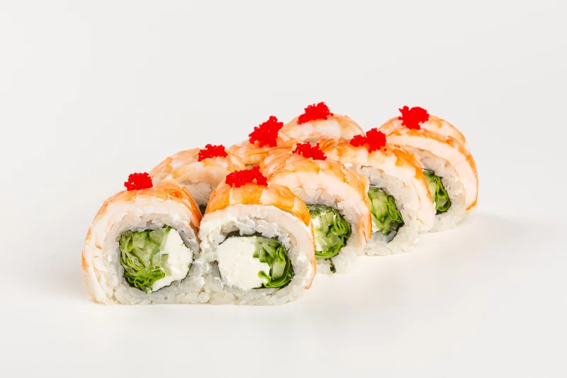 сыр сливочный, лист салата, свежий огурец, креветки тигровые, масаго красная *товар на фото может отличаться от оригинала