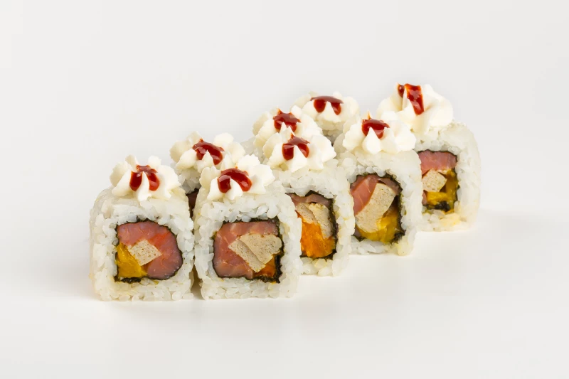 филе лосося, японский омлет томаго, манго, сыр сливочный, соус спайси *товар на фото может отличаться от оригинала
