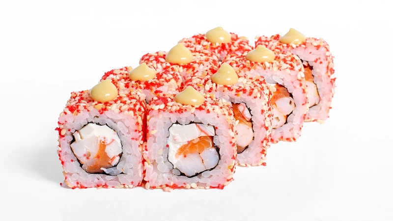филе лосося, снежный краб, тигровая креветка, сыр сливочный, икра масаго, кунжут обжаренный, соус Васаби *товар на фото может отличаться от оригинала