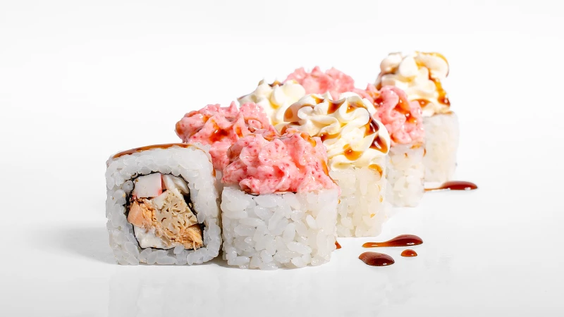 Лосось терияки, японский омлет томаго, снежный краб, сыр сливочный, соус Лава, соус Терияки *товар на фото может отличаться от оригинала