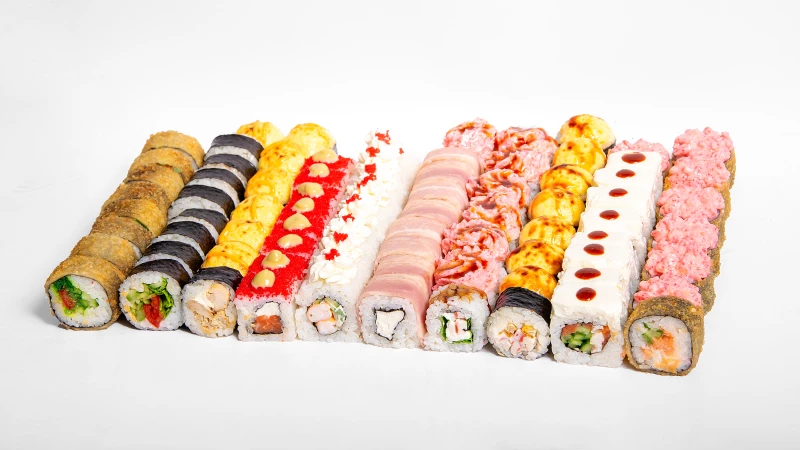 Филадельфия с беконом, Лава Кани, Аляска, Ролл Эби Лайт, Ролл Фреш, Калифорния Сяке, Запеченый с курицей HOT, Запеченый ролл с крабом, Темпура Лава, Темпура Ясай *товар на фото может отличаться от оригинала